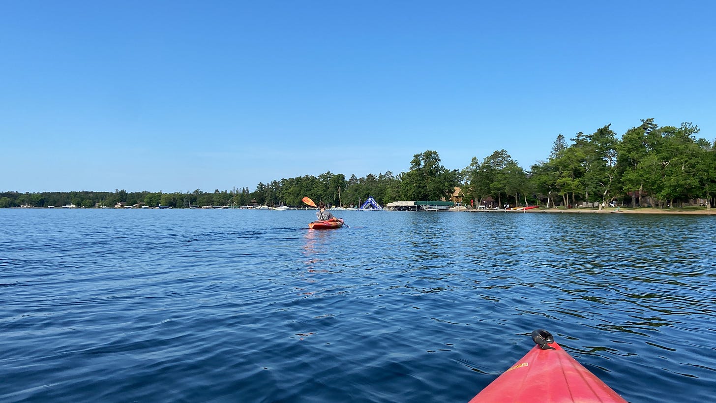The other novel element for me of life in Saint Paul is the social dimension. I've been joining "Meetup" groups, mostly related to reading, writing, and discussion. Plus one devoted to hiking and one focused on eating at "Mediterranean" places in the metro area. So I'm trying to get out and see new people frequently while I'm in the city. Up north, I'm mostly focused on spending time with my kids and a couple of friends. The family, of course, has begun planning their activities without me. So for part of the time I'm up north, they're out doing their own stuff.