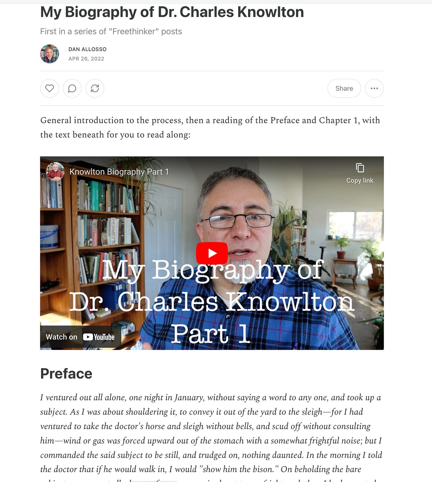 wrote an interesting post about the future of books on Substack that I thought raised some interesting questions and issues. I've also been thinking, for a while now, about the continuum of writing, from making notes on what I read to formulating these into ideas, to writing little essays about them, and ultimately to producing longer-form and book-length content. And about how and where Substack can fit into that process.I don't think it's a trivial process, going from blog posts to a book. My impression of some people who have done really well on Substack and then tried to shove their "greatest hits" into book form is that these have not been their most well-written books. But there are a lot of factors that could contribute to that, and they may not all be inevitable. I've also gone the other direction and serialized my biography of Dr. Charles Knowlton, posting its short chapters as individual posts, complete with my narration. It might be valuable to me if Substack created a way I could package that "playlist" of posts into a bundle that I could sell as a one-off, like a book. This might allow people to dip a toe into the water and see if they wanted to become subscribers.