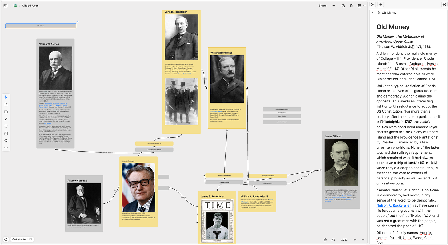 As promised, I started reviewing my notes on the Gilded Ages and loading them into Heptabase, where I hope to be able to create publishable “whiteboards” containing webs that link together all the families or businesses in whatever particular constellation I’m examining. I think this will be helpful in understanding how America operates. So I’m gradually adding notes that are extensively linked, based on a variety of connections. In this first pass, the connections were familial. I began with a 1988 book called Old Money: The Mythology of America's Upper Class, by Nelson W. Aldrich Jr., who is not really “Jr.” but IV (but as a friend reminded me, once the father is dead, the "Jr." can be amended). I figured I’d follow the links in this document and continue adding the connections from all the linked notes.