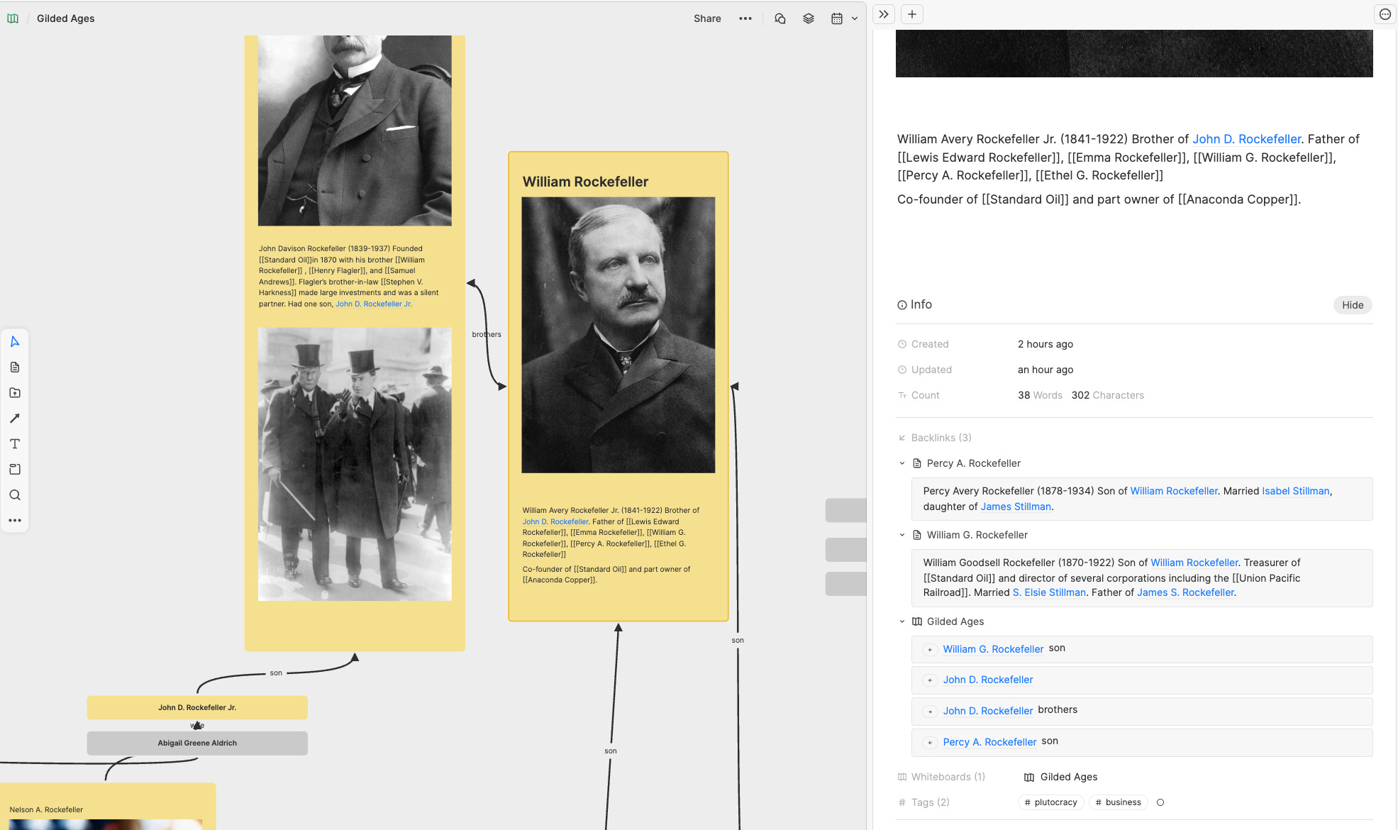 One of the cool things is that, in addition to the arrows I can draw, linking cards and describing the link (son, wife, brothers, etc.), all the backlinks I create by calling out another note with the “@” sign show up in the metadata about each note, when I examine it on the sidebar. That means if I want to briefly describe William Rockefeller’s family connections, for example, they’re all right there for me. When I add in his business connections, they’ll be there too. So I'll be able to click on any of those links to take me down the rabbit hole. I assume that means when I publish a whiteboard, my readers will be able to do the same. That approaches what I’m looking for in an app. So I’m satisfied with today’s experimenting. In case you want to examine the results, they're "published" here.
