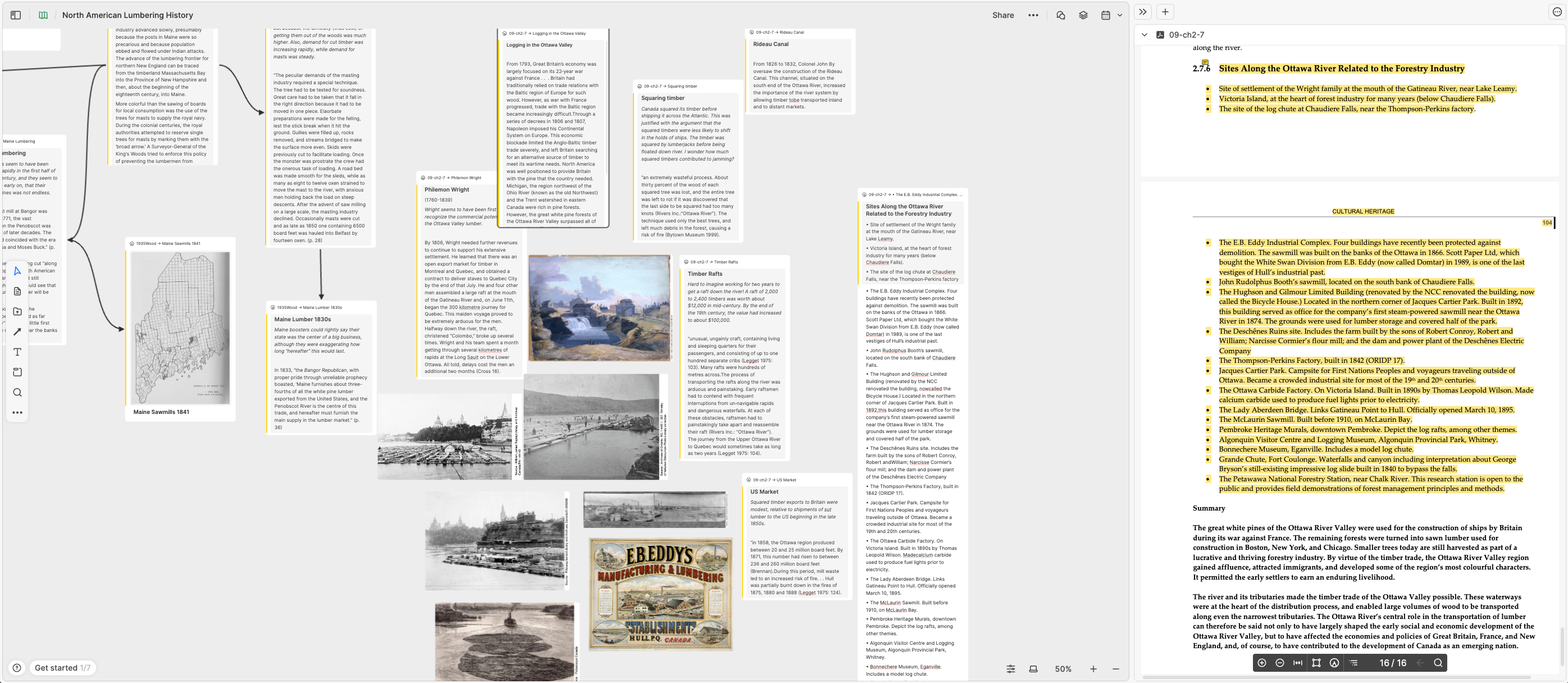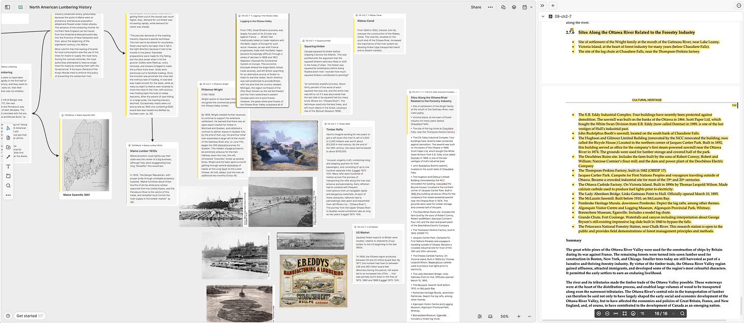 Took about another hour and processed another source in my White Pine Lumber library. This one was a chapter from a book-length document called A Background Study for Nomination of the Ottawa River Under the Canadian Heritage Rivers System, published by Ottawa River Heritage Designation Committee in 2005. It included not only a good and well-referenced story of logging on the Ottawa River, but a bunch of images that I clipped out, to add to my whiteboard. I put these next to the Maine Lumber notes I made a couple of days ago. I tagged these “Canada” though, so I can find them all easily, plus the next set that I add about lumbering north of the border.