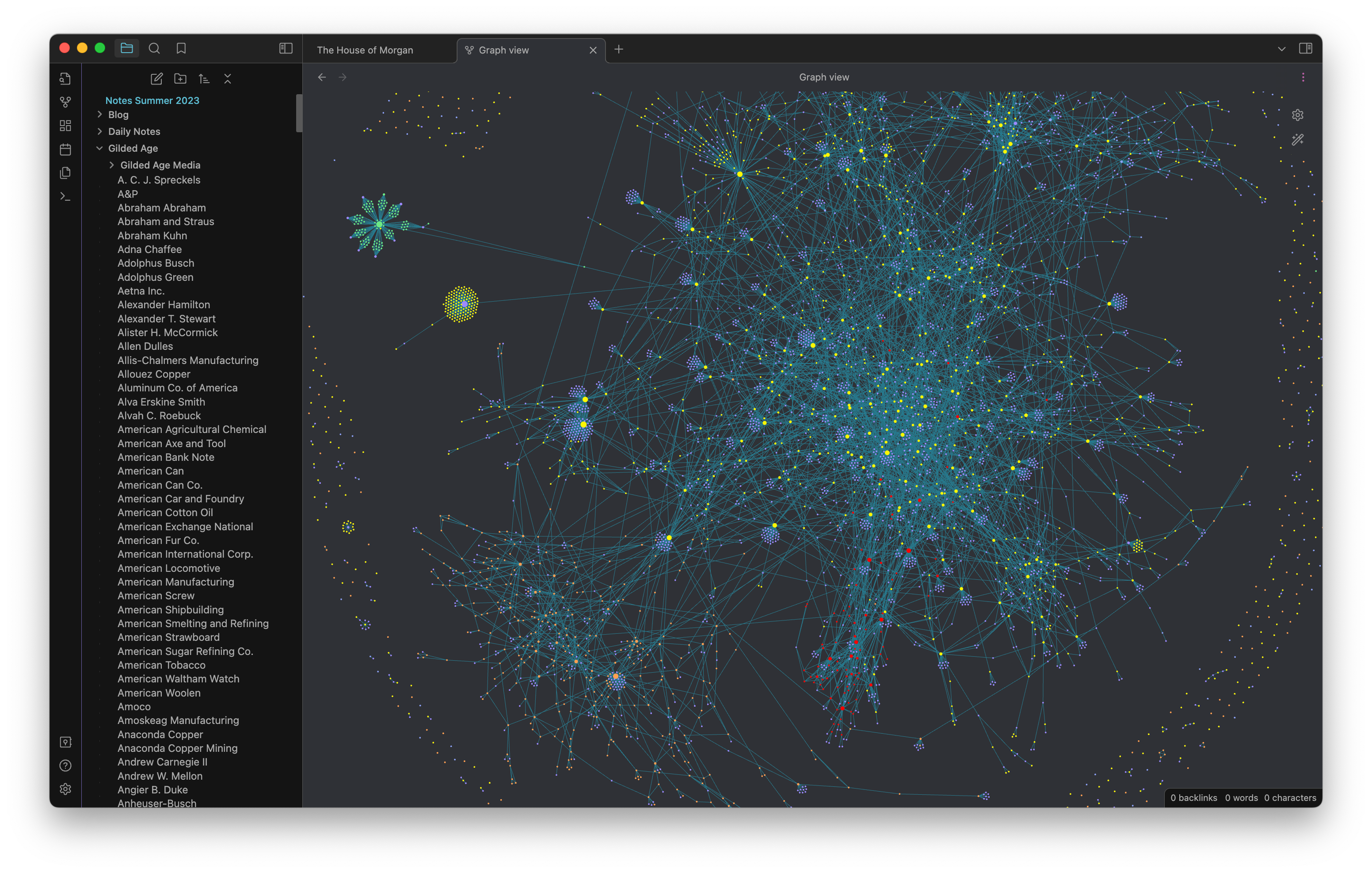 This fall I'll be pursuing this: adding new nodes and connecting more of them together. I'll also learn (or relearn) how to use the note-level features on the righthand sidebar. This result, I suspect, will be a gradual expansion of the connectedness of these webs related to specific projects and also I hope some interesting connections I'll notice between info and ideas across these spaces. It'll be interesting to see, for example, if there are some elements of my research into the Gilded Age that connect more with other topics I'm pursuing? Are the ideas or people that connect more obviously to more mainstream or well-known stories a way to bring an audience into the history I want to describe by stages? From the familiar to the unfamiliar? A way to complicate things people think they already know and open some doors to encourage them to consider a different point of view or explanation?