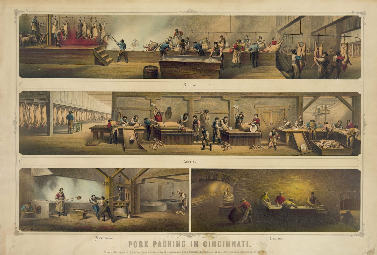 Margaret Walsh followed up on her 1972 book, The Manufacturing Frontier, with a look at the transition (between 1840-1870 more or less) of pork processing from a local, seasonal activity to an industry. She explained, “pork packing is a good tool of analysis because agricultural processing early disseminated an industrial experience to newly settled farming country.” But also, it seems obvious, because primary processing is industry. By 1870, Walsh said, the midwest was already “responsible for 27 percent of the nation’s value added.” William Cronon notwithstanding, a lot of that took place outside Chicago.